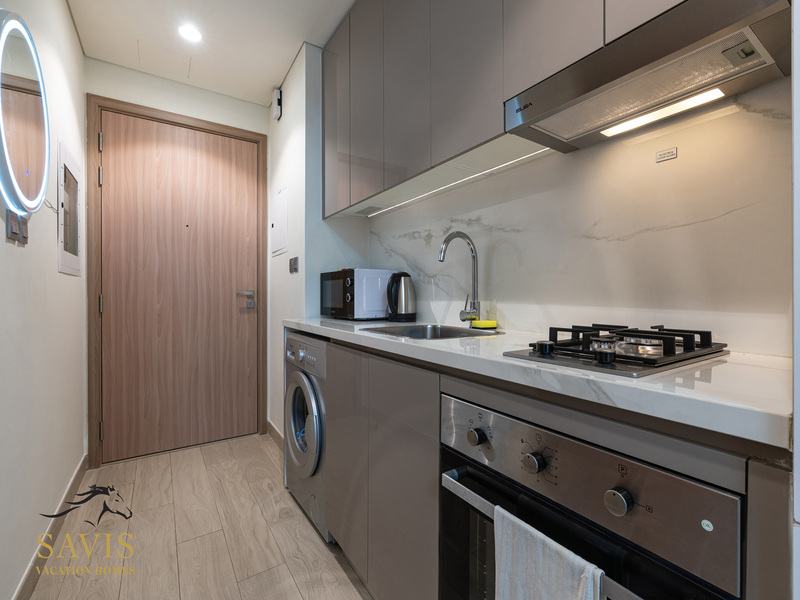 Adjacent to the living area is the well-equipped kitchen, where you’ll find everything you need to prepare delicious meals during your stay. From sleek appliances to ample counter space, cooking here is a pleasure. The dining table comfortably seats two, perfect for enjoying meals together or catching up on work.
